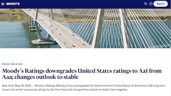 当地时间5月16日,国际信用评级机构穆迪(MCO.US)(Moody’sRatings)宣布将美国主权信用评级从Aaa下调至Aa1,同时将美国主权信用评级展望从负面调整为稳定。